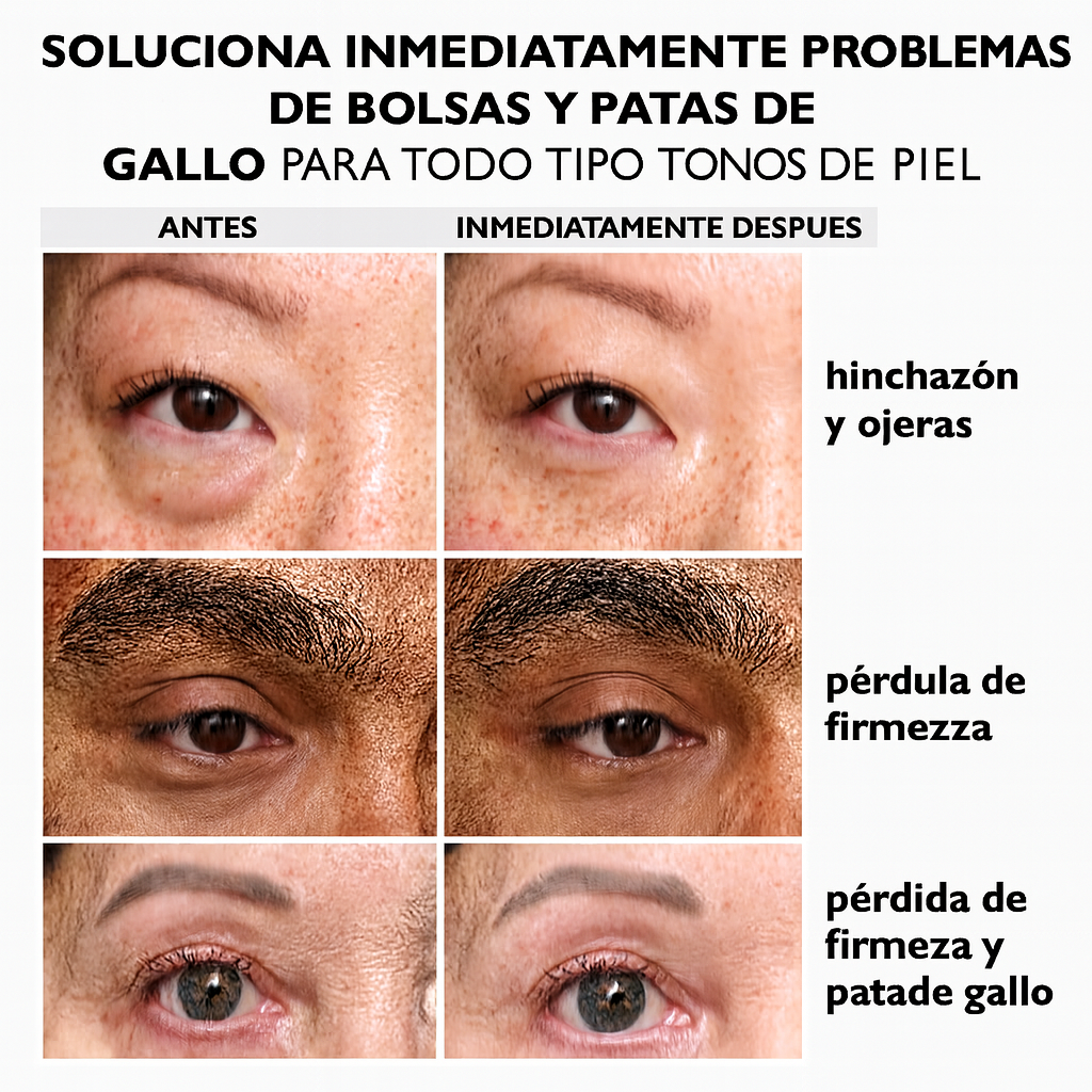 Elimina bolsas, patas de gallo y arrugas de expresión, dejando la piel más lisa y rejuvenecida al instante.